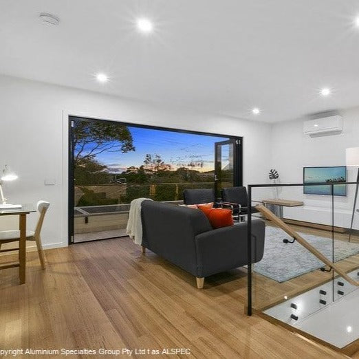DESCRIPTION: For a modern designer look, the Bi-Fold Door extrusions are a consistent 85mm wide face on both the stiles and rails. This allows a balanced visual face and allows a vast array of hardware lock options.